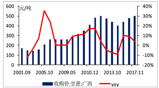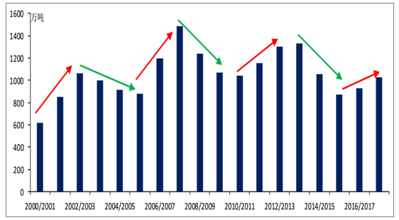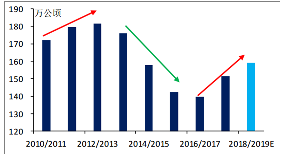 我國(guó)甘蔗主產(chǎn)區(qū)廣西實(shí)施甘蔗最低收購(gòu)價(jià)政策,每年開(kāi)榨前制定當(dāng)年甘蔗收購(gòu)價(jià)。2017/2018榨季廣西甘蔗收購(gòu)價(jià)由475元/噸提高至500元/噸,種植面積進(jìn)一步增加。此外,從歷史上來(lái)看,我國(guó)糖產(chǎn)量仍處于三年增產(chǎn)周期,預(yù)計(jì)國(guó)內(nèi)糖2018/2019榨季供應(yīng)增加。