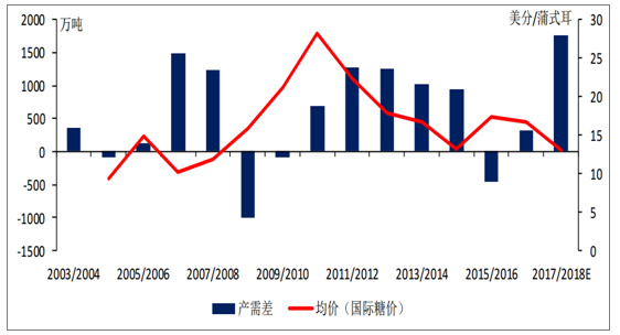 國(guó)際糖價(jià)與全球產(chǎn)需差成顯著負(fù)相關(guān)關(guān)系,具體表現(xiàn)為:全球產(chǎn)需趨緊或者出現(xiàn)缺口,國(guó)際糖價(jià)上漲;產(chǎn)需過(guò)剩,國(guó)際糖價(jià)下跌。全球糖價(jià)漲跌通過(guò)進(jìn)口傳導(dǎo)至國(guó)內(nèi),從而引發(fā)內(nèi)糖價(jià)格變動(dòng)。