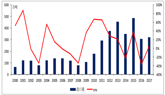 歷年國(guó)內(nèi)糖進(jìn)口數(shù)量及增速