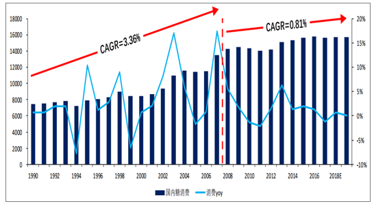 自1990年以來(lái),我國(guó)白糖消費(fèi)經(jīng)歷了快速發(fā)展期與穩(wěn)定期兩個(gè)階段:1990-2007年間白糖消費(fèi)受到經(jīng)濟(jì)發(fā)展與人口增長(zhǎng)的拉動(dòng)快速提升,由1990年745.1萬(wàn)噸增長(zhǎng)到1350萬(wàn)噸,增長(zhǎng)81.18%,年復(fù)合增長(zhǎng)達(dá)到3.36%;2008年后由于經(jīng)濟(jì)發(fā)展疲軟等原因,白糖消費(fèi)穩(wěn)定在1400-1600萬(wàn)噸左右。